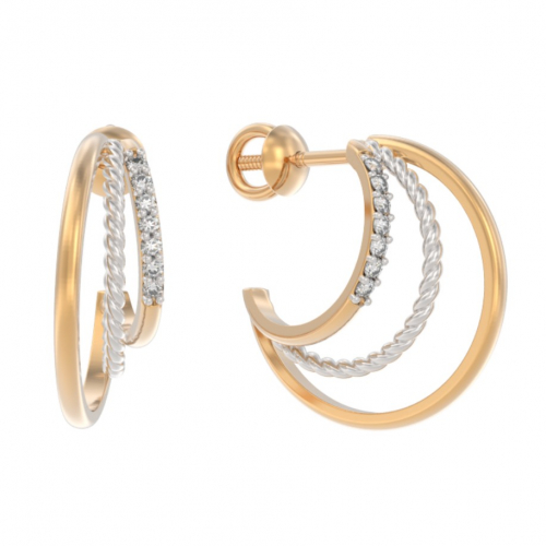 Стильные серьги-пусеты выполнены из благородного сочетания красного и белого золота 585 пробы и украшены сверкающими фианитами