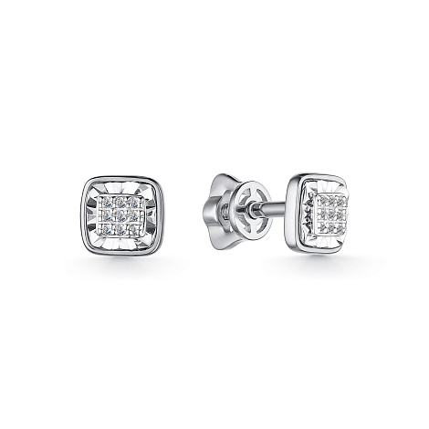 Серьги - пуссеты, украшенные сверкающими бриллиантами в оригинальном касте, выполнены из белого залота 585 пробы