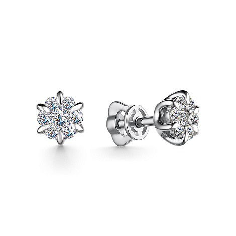 Серьги-пусеты круглой формы с бриллиантом в центре, блеск и красоту которого усиливают бриллианты меньшего размера, выполнены из белого золота 585 пробы