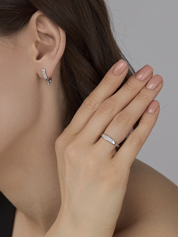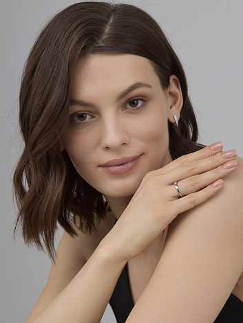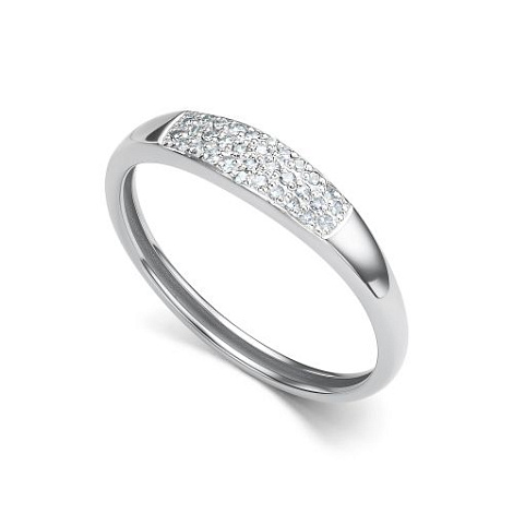 Нежное кольцо выполнено из белого золота 585 пробы, украшено сияющей россыпью бриллиантов