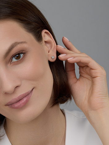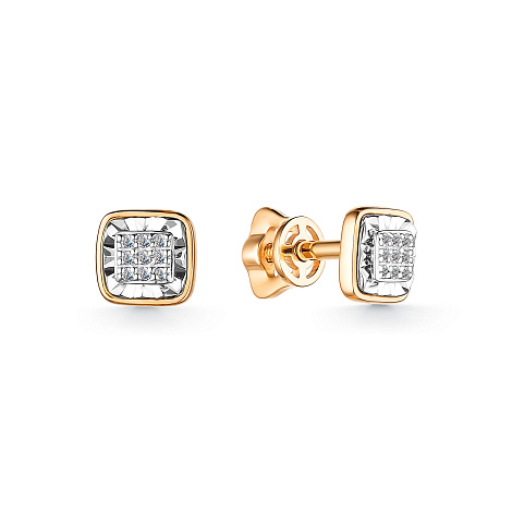 Серьги - пуссеты, украшенные сверкающими бриллиантами в оригинальном касте, выполнены с сочетанием красного и белого залота 585 пробы