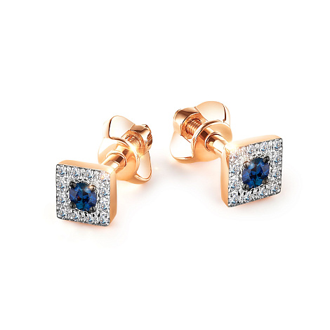 Изящные серьги - пусеты квадратной формы с натуральными сапфирами в окружении сверкающих бриллиантов, выполнены из красного и белого золота 585 пробы