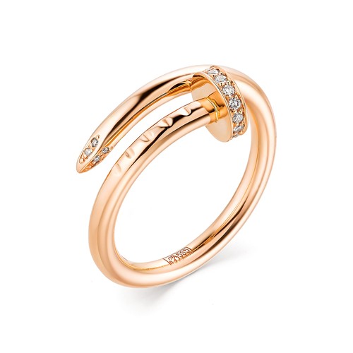 Кольцо очень оригинальной формы и дизайна выполнено из красного золота 585 пробы и украшено искрами бриллиантов.