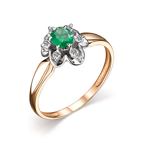 Элегантное кольцо с натуральным изумрудом и бриллиантами в фантазийном касте в виде цветка, выполнено с сочетанием красного и белого золота 585 пробы