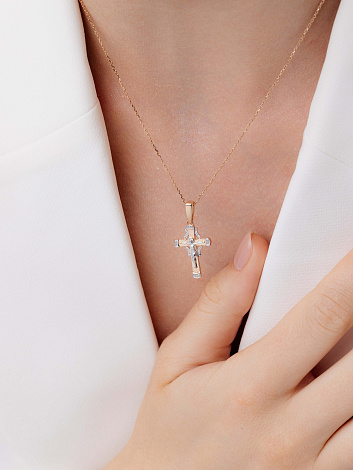 Подвеска в виде креста, в котором исполнены все каноны Православной церкви, выполнен с сочетанием красного и белого золота 585 пробы. Украшен великолепными сияющими бриллиантами. Закрепка камней в белом золоте визуально увеличивает их объем и подчеркивает блеск и красоту. Изделие представлено брендом Алькор. Средняя характеристика камней на артикул: 12 Бриллиант Круг 17 0.019 2/3. К украшению прилагается сертификат от производителя о подлинности драгоценных камней. В комплект поставки входит: