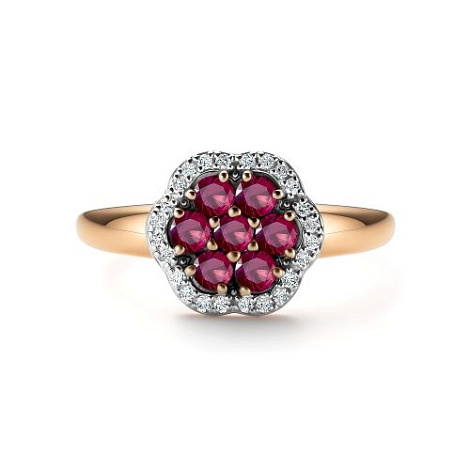 Элегантное кольцо с натуральным рубином в окружении сверкающих бриллиантов, выполнено из красного и белого золота 585 пробы. Сочетание драгоценных металлов особенным образом подчёркивает и усиливает насыщенный цвет и сияние камней. Изделие представлено брендом "Алькор". Средняя характеристика камней на артикул: 24 Бриллиант Круг 57 0.128 4/5, 7 Рубин Круг 0.55 2/2 В комплект поставки входит: