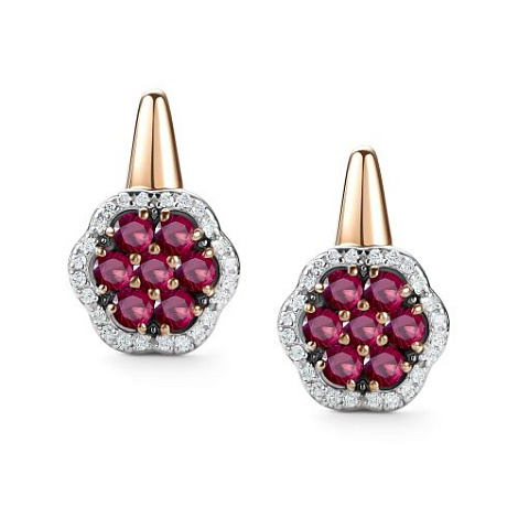 Серьги с натуральными рубинами, красоту и блеск которых подчёркивают изящные дорожки сверкающих бриллиантов, выполнены с сочетанием красного и белого золота 585 пробы