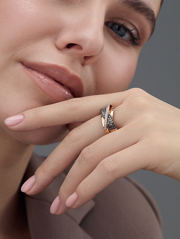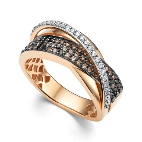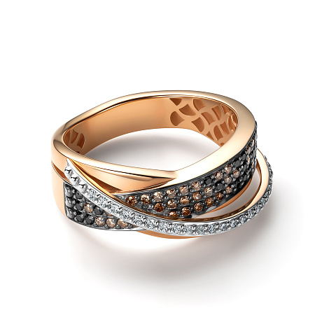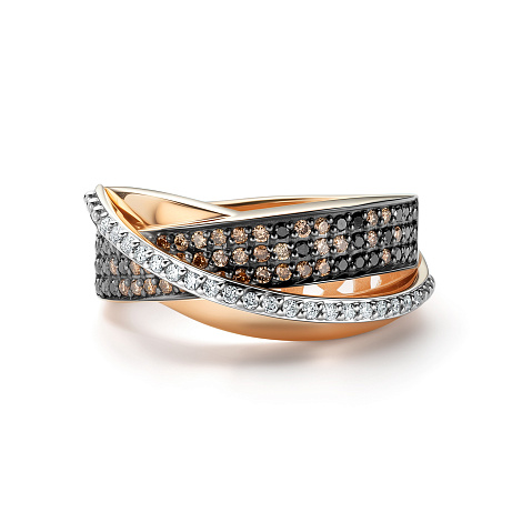 Объемное кольцо в сочетании красного и белого золота 585 пробы. Черные и коньячные бриллианты, искусно расположенные, создают яркий контраст и добавляют изделию роскоши. Такой аксессуар подчеркнет индивидуальность своего владельца и станет ярким акцентом любого образа. Представлено брендом АЛЬКОР. Вставки: 20 Бриллиант Круг 57 0.11 4/5, 20 Бриллиант Круг 57 0.125 7/6 черный(HPHT), 40 Бриллиант Круг 57 0.232 7/6 коньяк В комплект поставки входит: