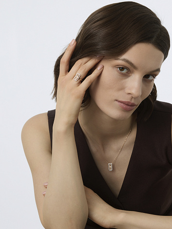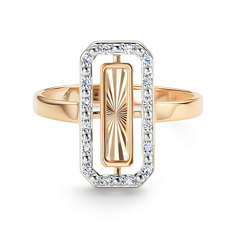 Геометрическое кольцо из красного и белого золота 585 пробы, украшенное сверкающими бриллиантами, поражает своей современностью и утонченностью