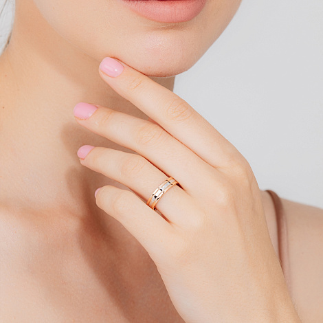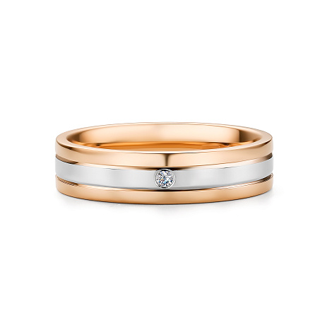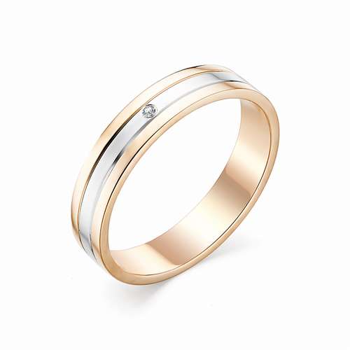 Обручальное кольцо из сочетания белого и красного золота 585 пробы, украшенное центральным бриллиантом полной огранки, — это ювелирное произведение, сочетающее в себе благородство металлов и блеск драгоценного камня