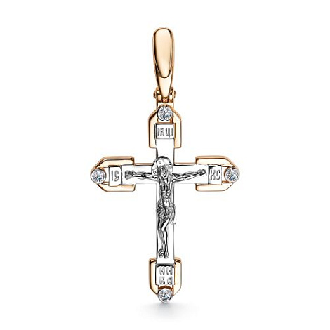 Подвеска в виде нательного креста прямой формы выполнена из комбинированного золота 585 пробы, украшенная сияющими бриллиантами
