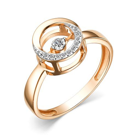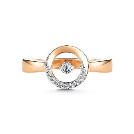 Кольцо с сверкающим бриллиантом в центре, красоту которого подчёркивает дорожка меньших по размеру бриллиантов, выполнено из красного и белого золота 585 пробы