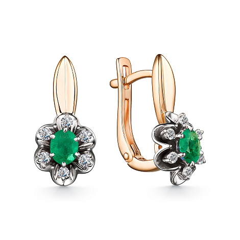 Роскошные серьги с натуральными изумрудами в окружении сияющих бриллиантов, выполнены с сочетанием красного и белого золота 585 пробы. Фантазийный каст из белого золота подчеркивает насыщенный цвет изумруда и блеск бриллиантов. Тип замка - английский, самый надежный и удобный.