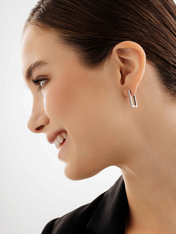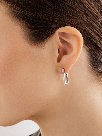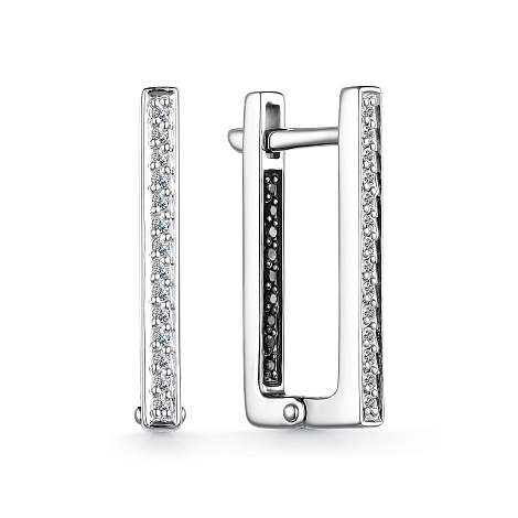 Стильные серьги, украшенные бесцветными и чёрными бриллиантами, выполнены из белого золота 585 пробы. Оригинальный лаконичный дизайн и контрастное сочетание драгоценных камней - привлекают внимание с первого взгляда. Тип замка - английский, самый надежный и удобный.