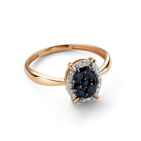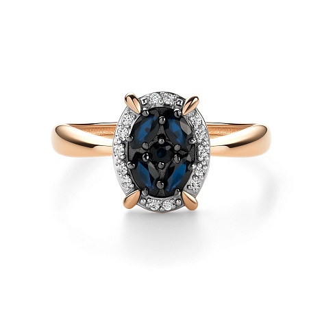 Роскошное кольцо, выполнено в сочетании красного и белого золота 585 пробы, с сапфиром тёмно-синего цвета и искрящейся россыпью бриллиантов
