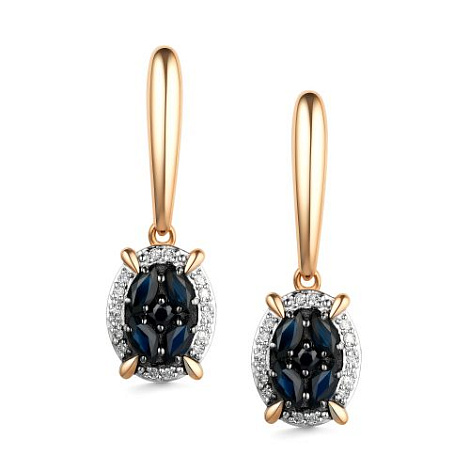 Роскошные серьги, выполнены в сочетании красного и белого золота 585 пробы, с сапфирами синего цвета в окружении искрящейся россыпи бриллиантов. Закрепка бриллиантов в белом золоте, придает камням объем и подчеркивает их природную красоту и игру света. Тип замка - английский, самый надежный и удобный. Изделие представлено брендом "Алькор". Средняя характеристика камней на артикул: 28 Бриллиант Круг 17 0.088 2/3, 2 Сапфир Круг 0.09 2/2, 8 Сапфир Маркиз 0.865 2/2 В комплект поставки входит: