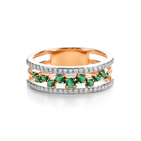 Изысканное кольцо из красного и белого золота 585 пробы украшено роскошной дорожкой изумрудов и дорожками сверкающих бриллиантов