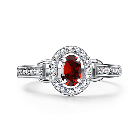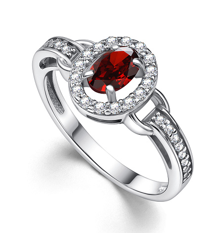 Изящное кольцо из серебра 925 пробы украшено натуральным гранатом и мелкими сверкающими фианитами