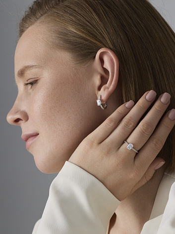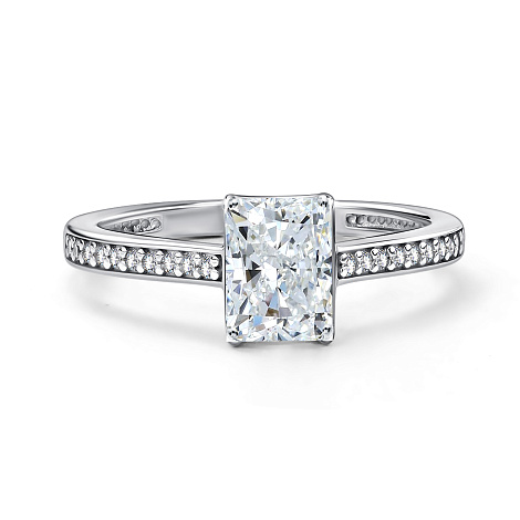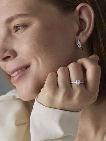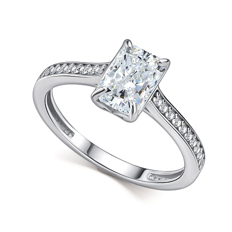 Изящное кольцо из серебра 925 пробы украшено сверкающим бриллианитом и мелкими фианитами