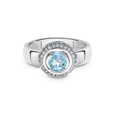 Изящное кольцо из серебра 925 пробы украшено прозрачным топазом и мерцающими фианитами. Четкие линии и благородный блеск металла гармонично подчеркивают красоту и сияние камней, делая украшение стильным и элегантным дополнением к вашему образу. Представлено брендом АЛЬКОР. Средняя характеристика камней: 1 Топаз Sky Blue Голубой Круг 0,977, 24 Фианит Белый Круг 0,408, 24 Фианит Белый Круг 0,216 В комплект поставки входит: