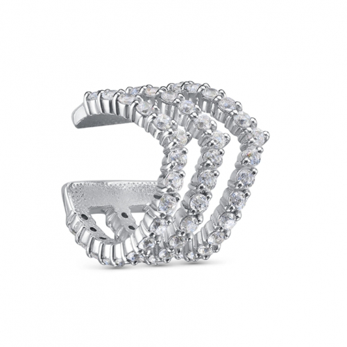 Элегантный серебряный кафф с современным дизайном: три изогнутые полосы, полностью усыпанные сверкающими фианитами, создают объемный и динамичный узор, переливающийся в каждом свете