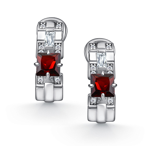 Элегантные серебряные серьги из серебра 925 пробы, украшенные сочными гранатами и сверкающими фианитами. Лёгкий дизайн и богатая игра цветов сделают это украшение любимым аксессуаром для повседневного образа и торжественных событий. Представлено брендом АЛЬКОР. Средняя характеристика камней: 2 Гранат Бордовый Квадрат 1,694, 2 Фианит Белый Багет 0,361, 16 Фианит Белый Круг 0,144 В комплект поставки входит: