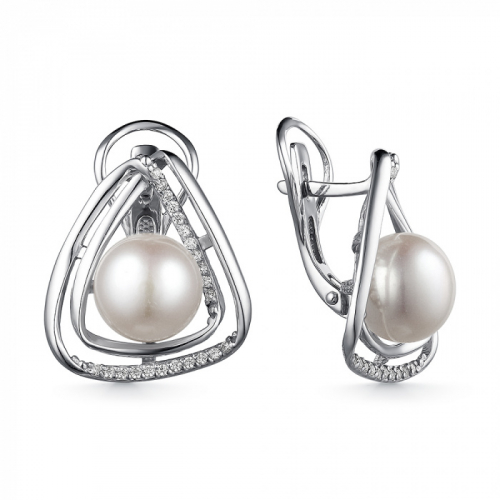 Изящные серебряные серьги из серебра 925 пробы украшены натуральным жемчугом и сверкающими фианитами