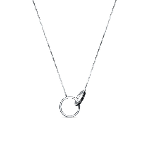 Стильное колье цепочкой, украшенное изящными подвесками - колечками, одно из которых инкрустированно черными бриллиантами, из белого золота 585 пробы