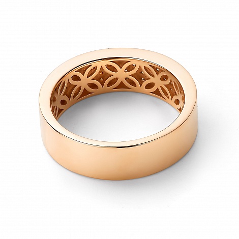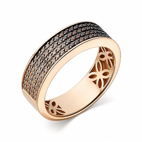 Роскошное широкое кольцо выполнено из красного золота 585 пробы, украшено россыпными дорожками великолепных бриллиантов разных цветов, образуя фантазийный рисунок.