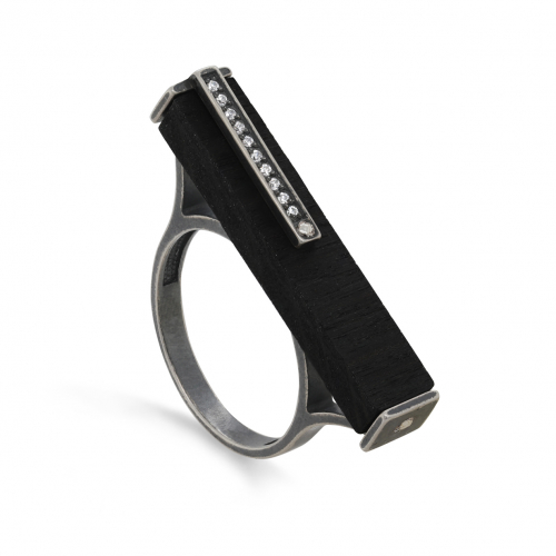 Эффектное и неординарное кольцо из серебра 925 пробы с черным деревом граб и сияющими фианитами