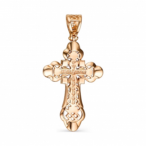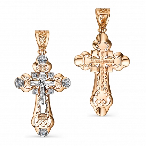 Православный крест выполнен в сочетании красного и белого золота 585 пробы. В нем исполнены все каноны Православной Церкви, на внешней стороне креста распятие, на обороте надпись "спаси и сохрани". Украшен сияющими бриллиантами.