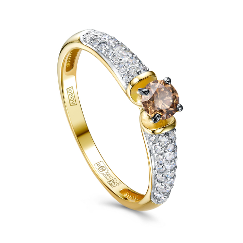 Изящное кольцо из желтого и белого золота 585 пробы украшено сверкающими белыми и благородным коньячным бриллиантом