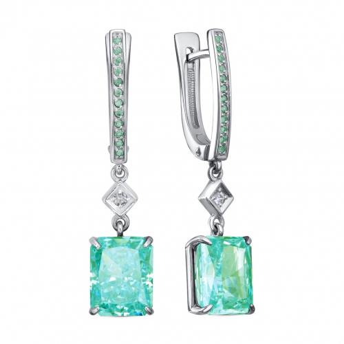 Серебряные серьги 925 пробы декорированы искрящимися бриллианитами и прозрачными фианитами, притягивающими взгляд своей эстетичной игрой света