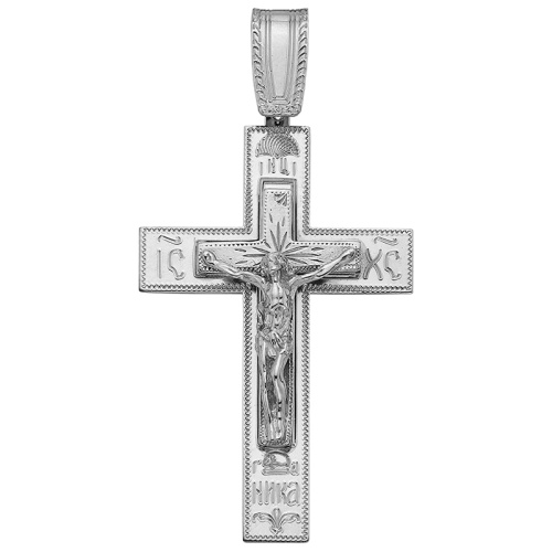 Подвеска в виде нательного креста выполнена из серебра 925 пробы с фактурным ажурным рисунком