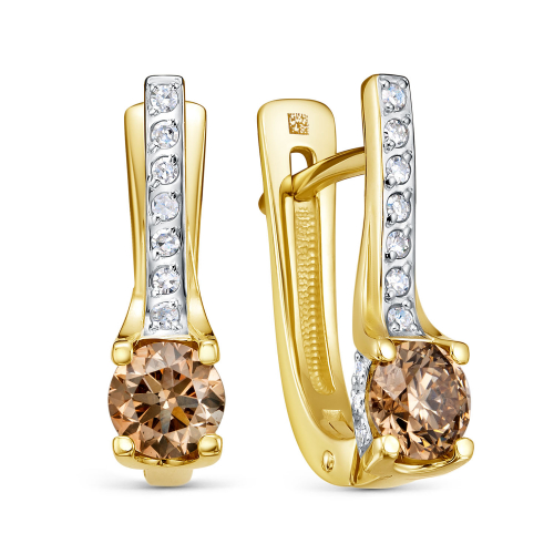 Серьги из желтого и белого золота 585 пробы выполнены в тонком сочетании теплых и холодных оттенков металла, украшенные роскошными коньячными и классическими белыми бриллиантами
