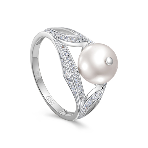 Кольцо из чистого белого золота 585 пробы демонстрирует идеальный союз природного шарма жемчуга и сияния классических бриллиантов