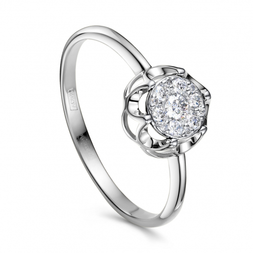 Кольцо из качественного белого золота 585 пробы украшено россыпью сверкающих бриллиантов, олицетворяя собой совершенство и изящество
