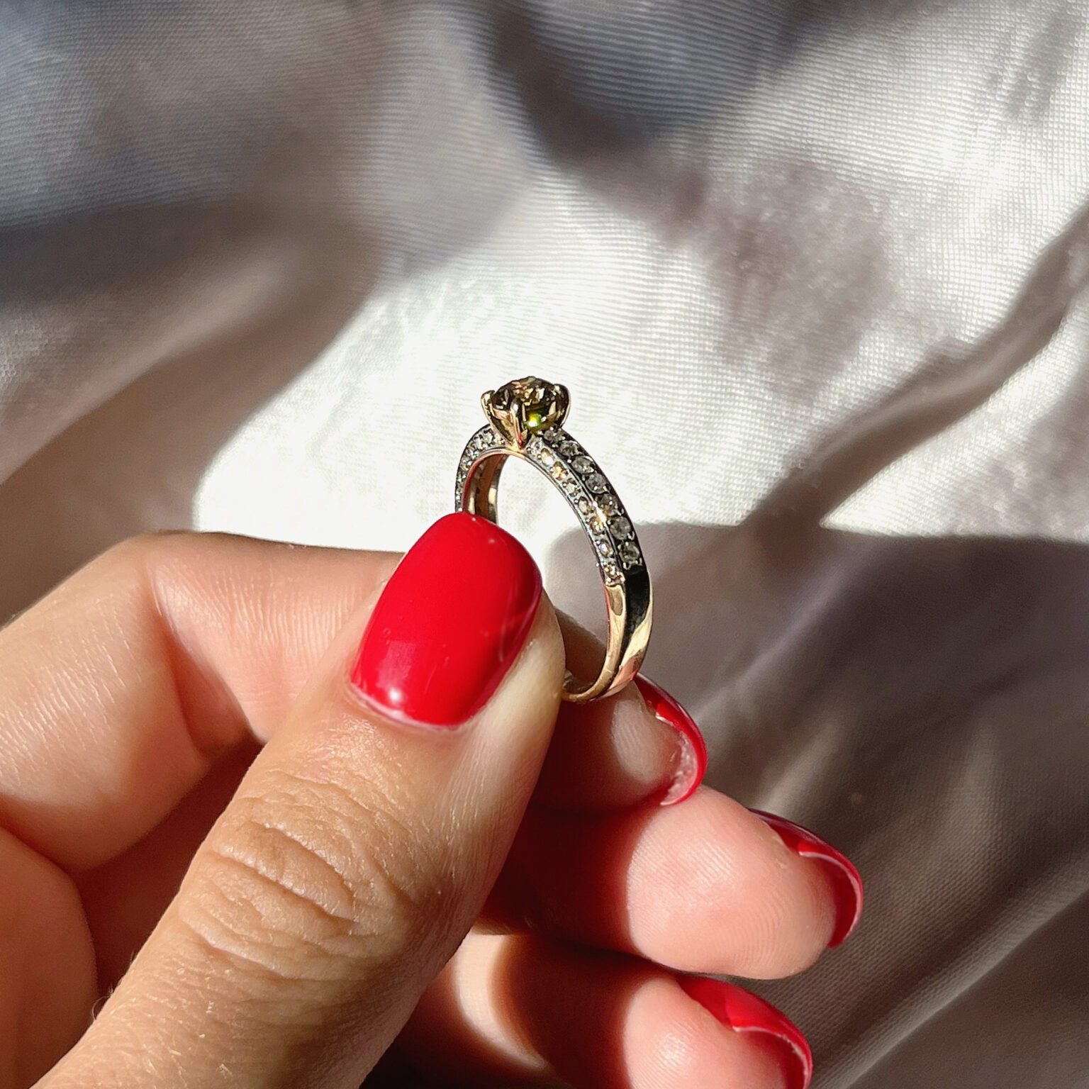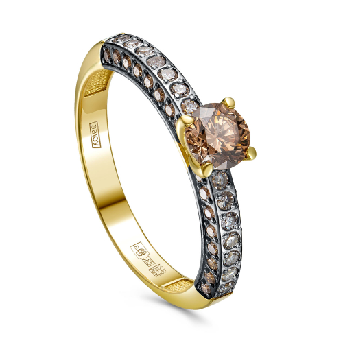Кольцо из тёплого жёлтого золота 585 пробы восхищает глубиной коньячного оттенка бриллиантов, объединённых с благородством металлического основания