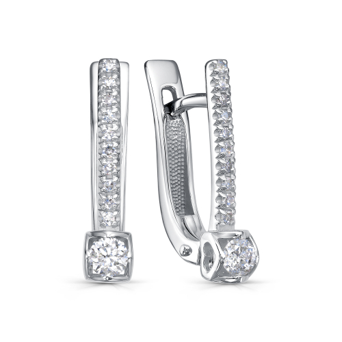 Серьги из высококлассного белого золота 585 пробы исполнены в классическом дизайне, украшенном традиционными бриллиантами