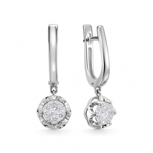 Серьги из высококлассного белого золота 585 пробы исполнены в классическом дизайне, украшенном традиционными бриллиантами
