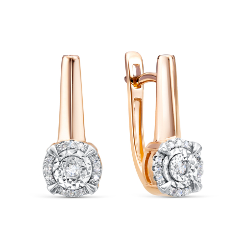 Серьги с сверкающими бриллиантами в фантазийном касте круглой формы, выполнены из красного и белого золота 585 пробы