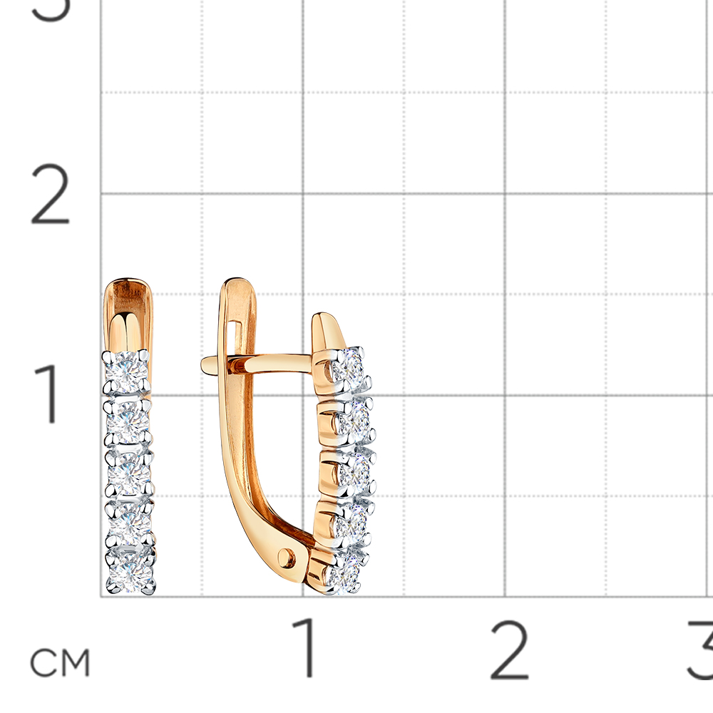 Элегантные серьги выполнены в сочетании красного и белого золота 585 пробы, украшенные дорожками ярких фианитов