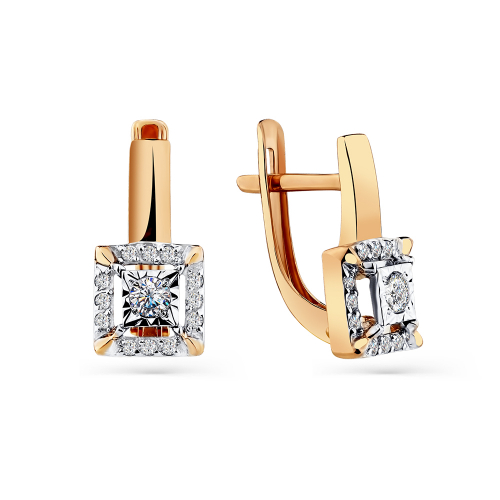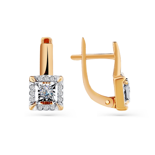 Изящные серьги с сверкающими фианитами в изящном касте квадратной формы, выполнены с сочетанием красного и белого золота 585 пробы