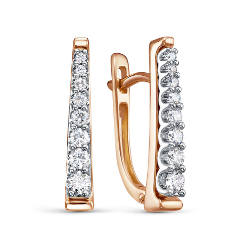 Элегантные серьги, выполнены в сочетании красного и белого золота 585 пробы, украшены сияющими бриллиантами. Такое украшение идеально дополнит любой Ваш образ. Тип замка - английский, самый надежный и удобный. Изделие представлено брендом ROSE GRACE. Средние характеристики вставки: 2 Бр Кр 57 2,65-2,75 10-15 4/6А - 0,156 ct.; 2 Бр Кр 57 2,35-2,45 15-20 4/6А - 0,106 ct.; 2 Бр Кр 57 2,06-2,20 25-30 4/6А - 0,074 ct.; 2 Бр Кр 57 2,00-2,05 30-40 4/6А - 0,064 ct.; 2 Бр Кр 57 1,65-1,75 40-60 4/6А - 0,04 ct.; 2 Бр Кр 57 1,45-1,55 60-90 4/6А - 0,028 ct.; 4 Бр Кр 57 1,20-1,25 120-200 4/6А - 0,032 ct. Украшение представлено брендом ROSE GRACE. В комплект поставки входит: