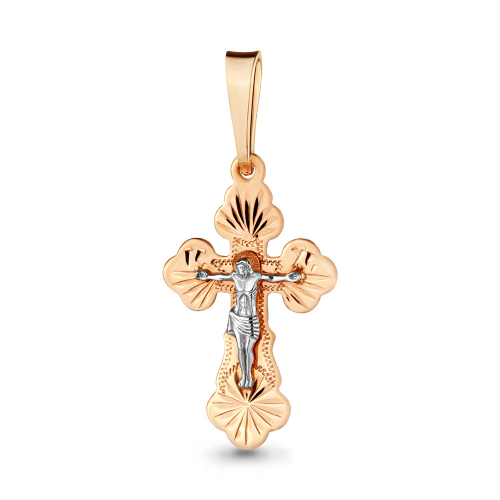 Миниатюрный православный крест выполнен в сочетании красного и белого золота 585 пробы, в нем исполнены все каноны Православной Церкви, на внешней стороне креста распятие, на обороте надпись "спаси и сохрани"