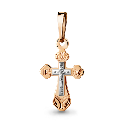 Православный крест выполнен в сочетании красного и белого золота 585 пробы, в нем исполнены все каноны Православной Церкви, на внешней стороне креста распятие