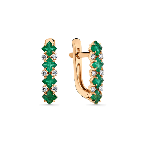 Элегантные серьги из красного золота с изумрудами и бриллиантами. Глубокий зелёный цвет камней в сочетании с сиянием алмазов создаёт роскошный и благородный образ, а надёжный английский замок обеспечивает комфорт и безопасность при носке. Представлено брендом MASTER BRILLIANT. Средняя характеристика камней: 8 Изумруд н. Квадрат 3*3 1,088; 12 Бр Круг 0,156 В комплект поставки входит: