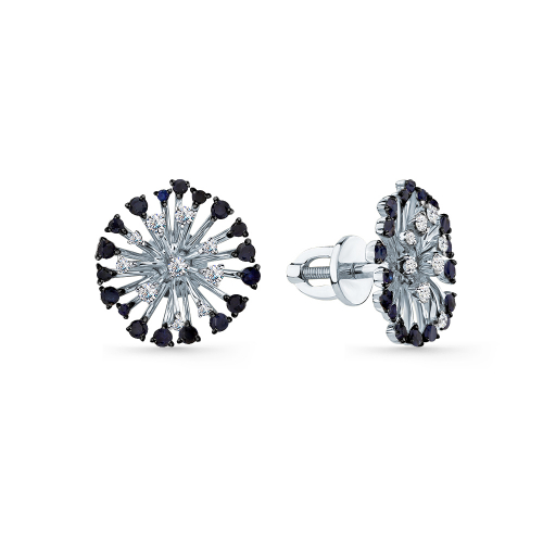 Изысканные серьги-пусеты из белого золота 585 пробы в дизайне одуванчиков, украшенные сапфирами и бриллиантами