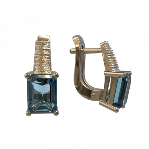 Элегантные серьги с голубыми топазами, выполнены из красного золота 585 пробы. Эффектная обработка сатинированием, при которой повехность драгоценного металла похожа на атлас, привлекает внимание с первого взгляда. Тип замка - английский, самый надежный и удобный.