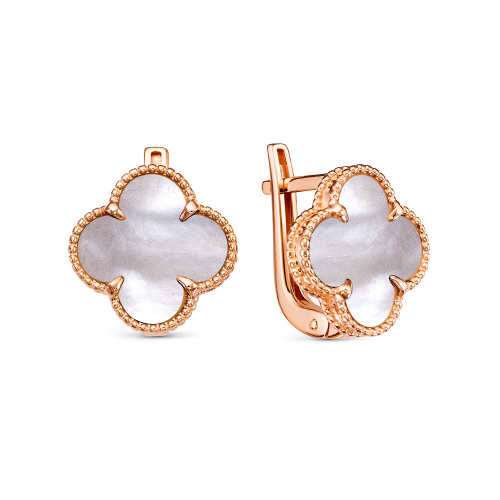 Нежные серьги с вставкой из перламутра в виде четырёхлистника выполнены из красного золота 585 пробы